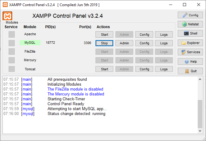 En tant qu’alternative à MariaDB , il est possible d’utiliser la base de données la plus connue MySQL si elle est déjà installée sur votre machine, en particulier dans les environnements Linux, tandis que dans Windows, ceux qui ont déjà installé XAMPP (parce que peut-être vous êtes déjà un utilisateur de QuizFaber 3) saura que le module MySQL est déjà disponible, peut-être vous avez juste besoin de démarrer le service: