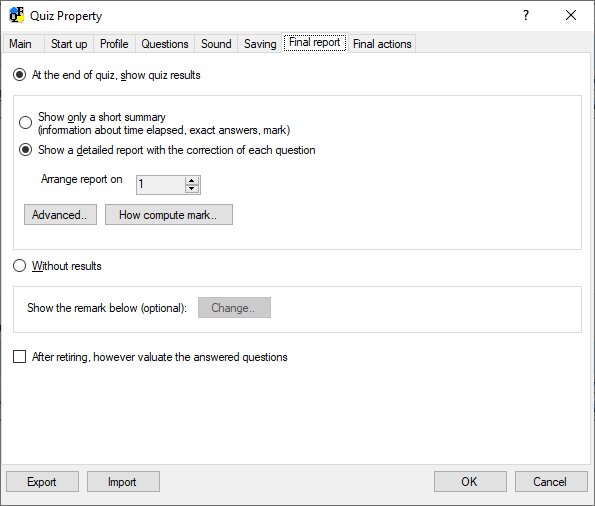 Such options are available in the Quiz menu , selecting the Properties item, in the sheet named "Final Report".