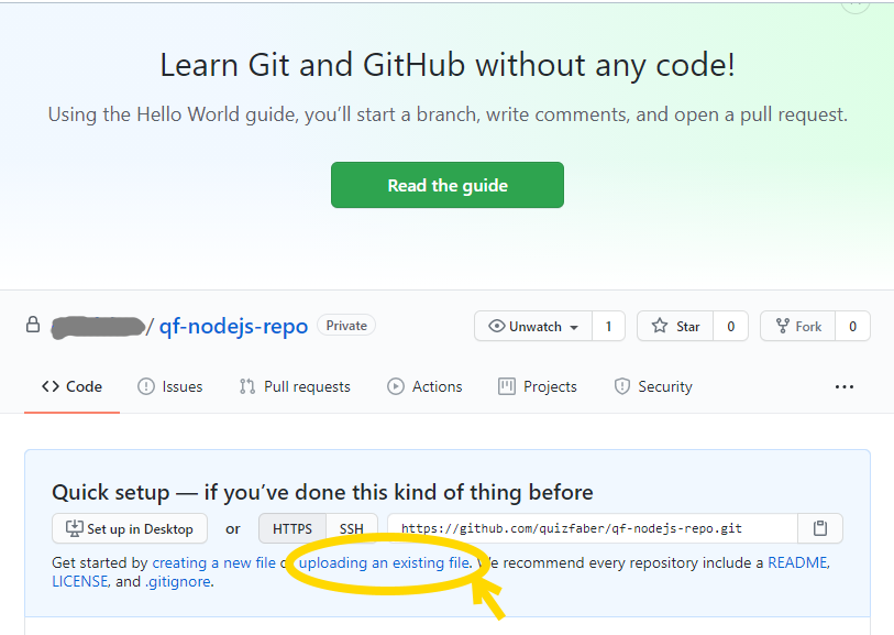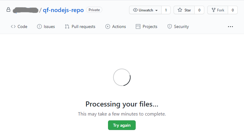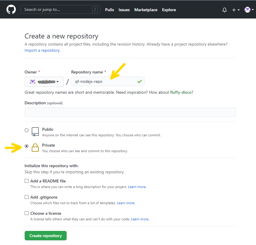 7) Choisissez un nom de référentiel (dans l’exemple : "qf-nodejs-repo"), sélectionnez "Private" et appuyez sur le "référentiel Créate":