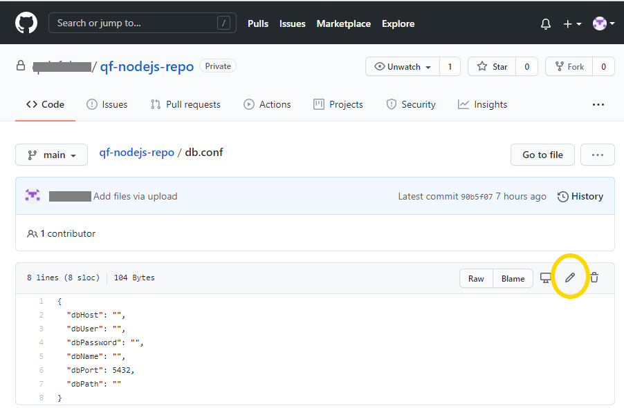 12) Le fichier s’ouvre. Pour pouvoir l’écrire, cliquez sur le symbole "crayon" (comme indiqué dans la figure), puis insérez les données copiées dans le point 9 (Host, Database, User, Port, Password) en gardant à l’esprit que dbName correspond à base de données (c’est-à-dire le nom de la base de données) et dbPath sera laissé vide: