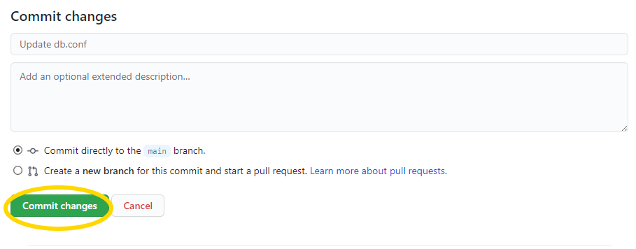 13) Lorsque les modifications de fichier sont terminées, faites défiler la page vers la section "Commit changes" et appuyez sur le bouton "Commit changes" :