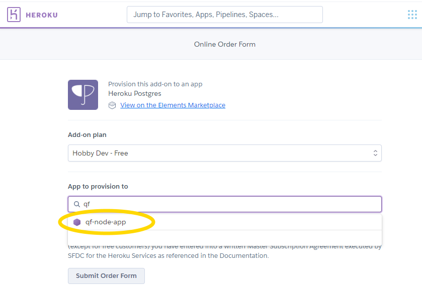 5) La page suivante vous permet de sélectionner l’application à laquelle associer la base de données. Laissez inchangé la sélection "Ad-on plan" comme "Hobby Dev - Free". Un clic à l’intérieur de la boîte de texte "App to provision to" pour faire apparaître la liste de drop-down des applications, qui dans notre cas est d’un seul élément: