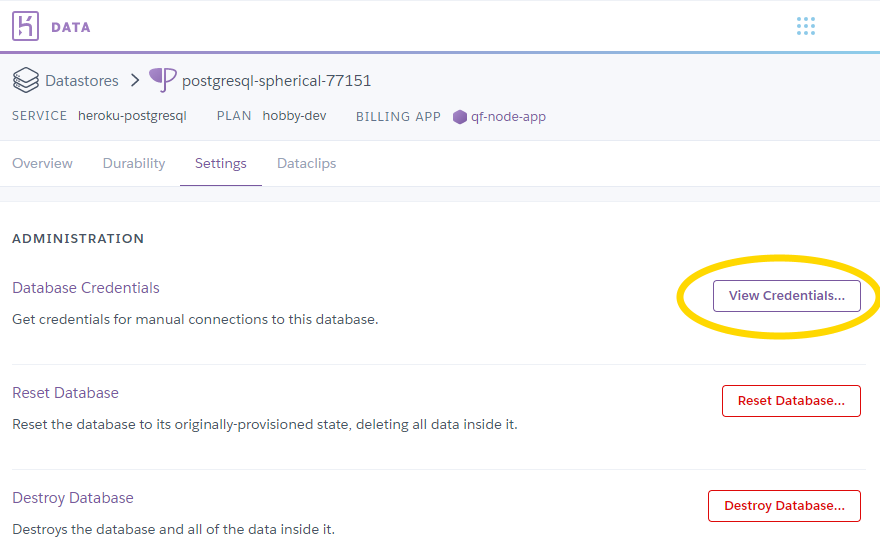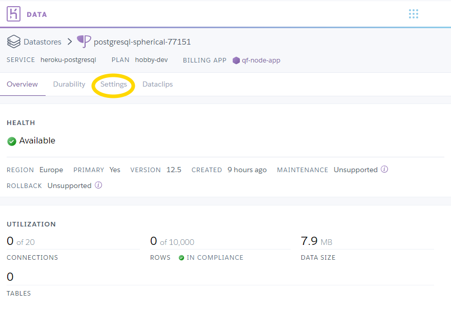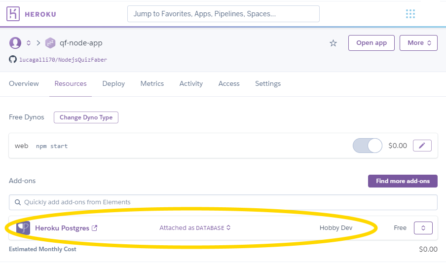 8) Comme vous pouvez le voir, sur "Ressources", nous avons la nouvelle base de données associée à l’application. Maintenant, nous avons besoin des paramètres de connexion de base de données pour être en mesure de le lier à l’application, Cliquez sur "Heroku Postgres" pour l’ouvrir:
