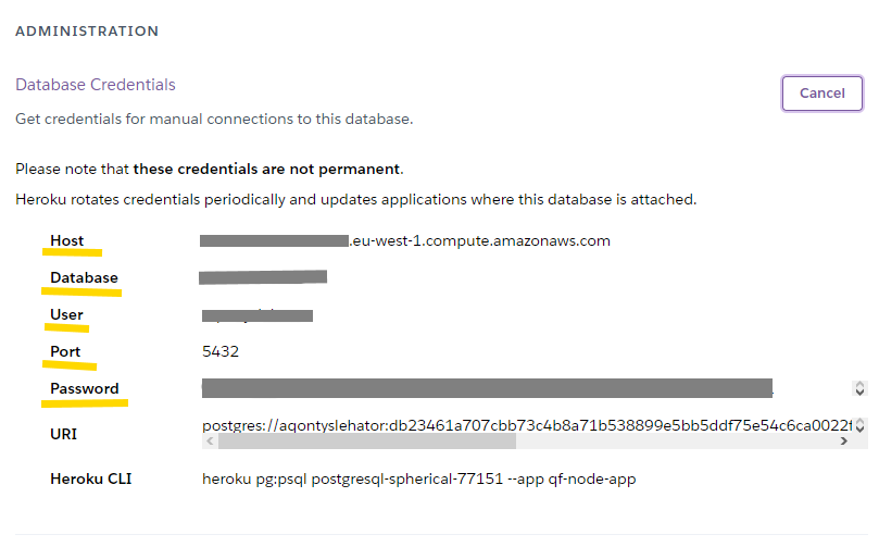 9) Prenez note (copier-coller sur le "bloc-notes") de Host, Database, User, Port, Password: