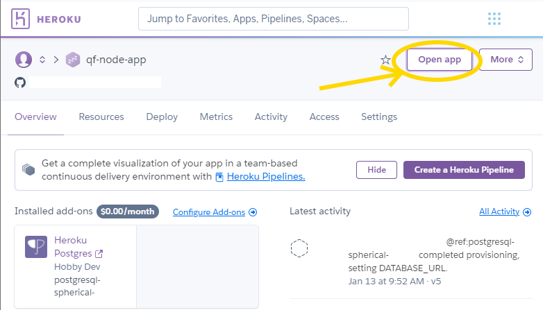 1) L’adresse de l’application créée dans Heroku est la suivante : connectez-vous au site : www.heroku.com et cliquez sur le bouton "Login in". Une fois que vous entrez votre dashboard, cliquez sur le nom de l’application: