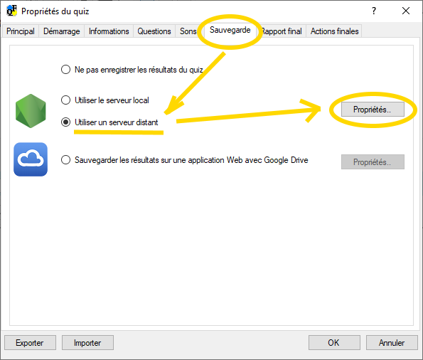 2) Ouvrez QuizFaber menu quiz, sélectionnez l’élément "Propriétés du Quiz", puis cliquez sur l’onglet "Sauvegarde", "Utiliser le serveur distant", puis cliquez sur le bouton "Propriétés" :