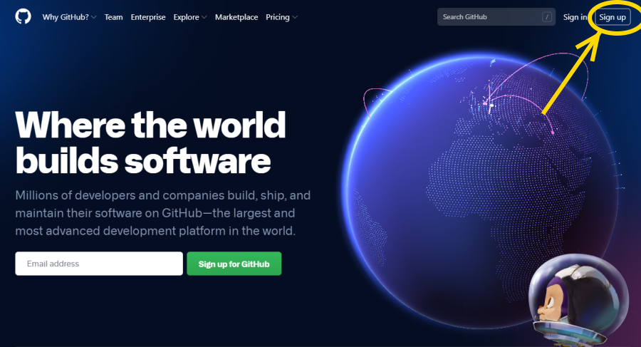 1) Con il navigatore preferito, collegarsi al sito : www.github.com e cliccare sul pulsante "Sign up" se non si è ancora registrati, o "Sign in" se si è già registrati: