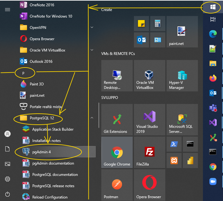 La voce pgAdmin4 si trova nel menu Start (di Windows) > PostgreSQL > pgAdmin4 , come mostra la seguente figura: