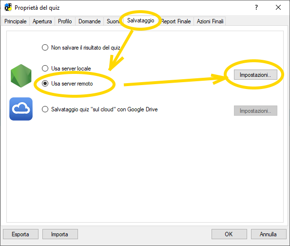 2) Aprire QuizFaber, "menu Quiz", selezionare la voce "Proprità quiz", quindi cliccare sul tab "Salvataggio", "Usa server remoto" ed infine "Impostazioni":