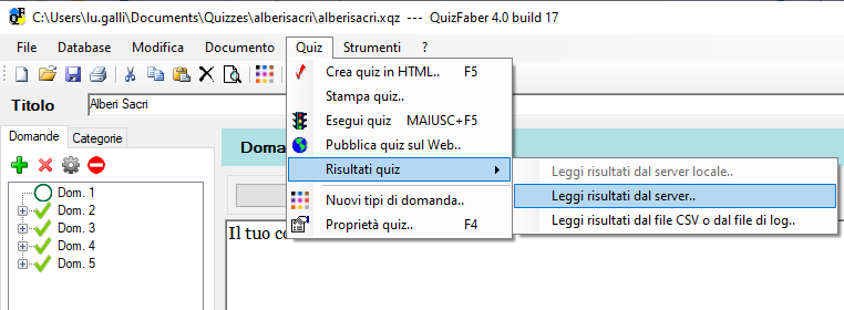Per visualizzare i risultati del quiz memorizzati col server remoto, aprire un quiz configurato per il salvataggio dei risultati nel server remoto, poi selezionare il menu quiz, poi la voce "Risultati quiz" e quindi "Leggi risultati dal server".
