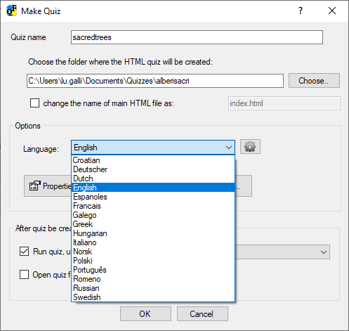 The choice is made in the "Create quiz" dialog box , choosing the language from the list, as shown in the following figure: