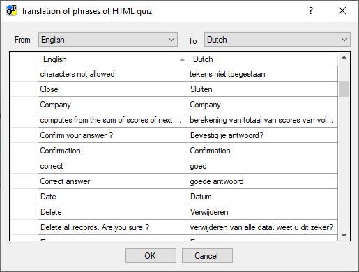 You can choose the language that the quiz will use to display the messages, the header of the questions and the results. Obviously the text of the questions and answers, entered by the user, will not be translated.