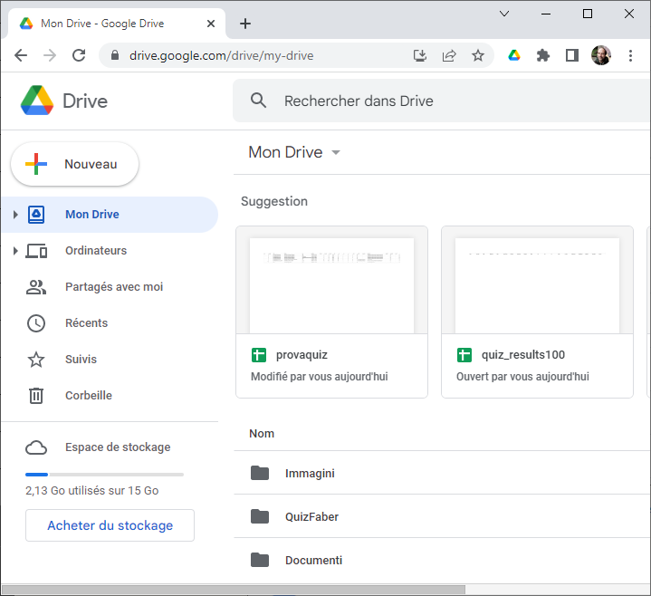 Dans la même page, ou dans votre dossier intérieur (comme dans l'exemple), vous pouvez également trouver les Google Sheets précédemment créées et configurées avec QuizFaber.