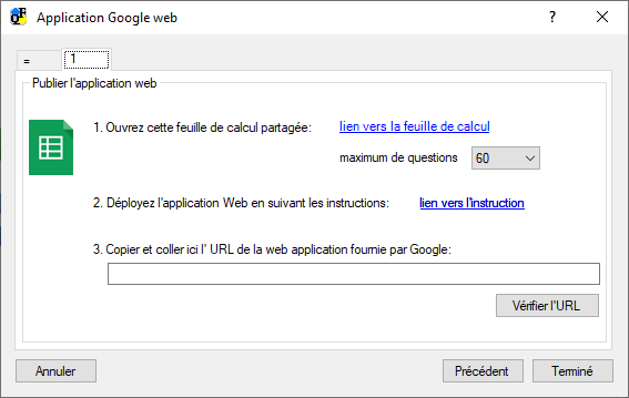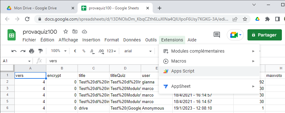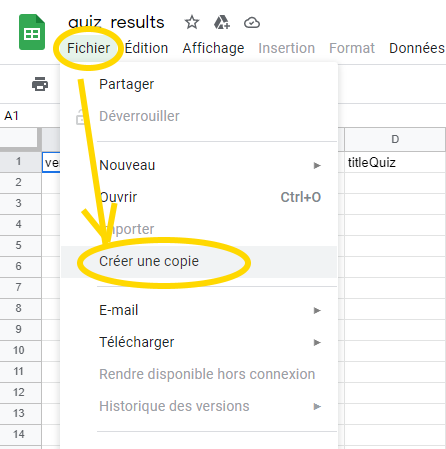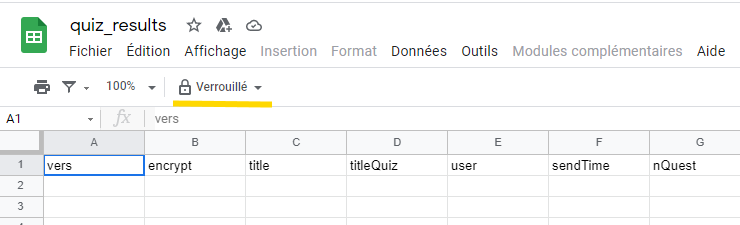 Une tableau est partagée à partir du Gdrive de l’auteur, qui contient déjà le nom des colonnes et le script qui constitue l’application Web utilisée par QuizFaber. C’est le lien