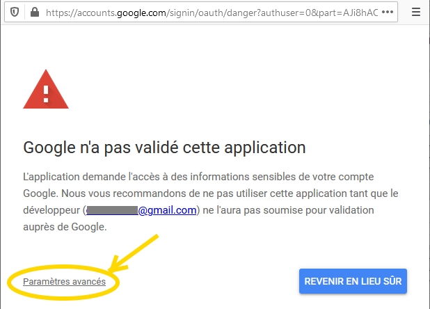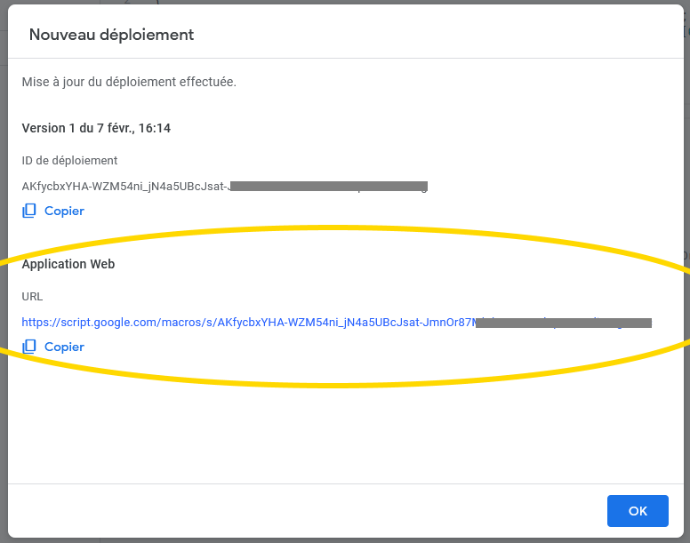 L’adresse URL (celle commençant par : https://script.google.com/macros/..) doit être copiée à la fenêtre suivante, comme indiqué dans la figure suivante :