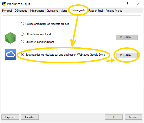 Click sur l’onglet Sauvegarde , puis sélectionnez "Sauvegarde les résultats sur une application Web avec Google Drive" puis cliquez sur le bouton "Propriétés":