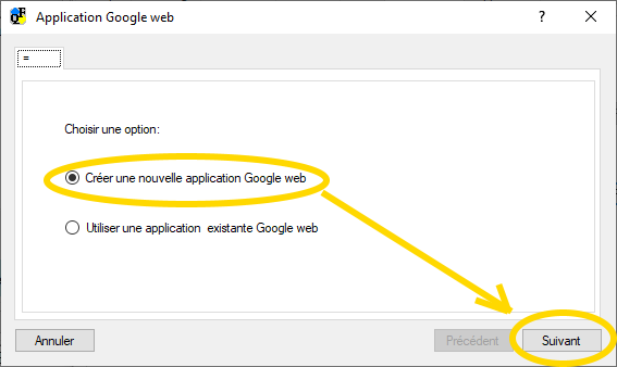 Selcez le premier élément "Créer une nouvelle application Google web", puis cliquez sur bouton "Suivant":