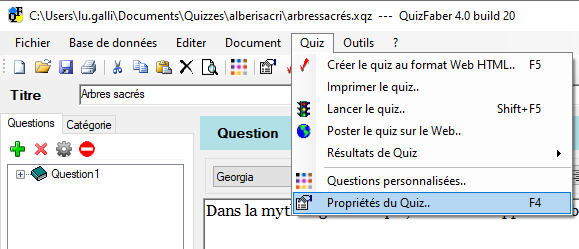 Open QuizFaber , choisissez n’importe quel quiz ou un nouveau, sélectionnez le menu Quiz > Quiz Propriétés du Quiz: