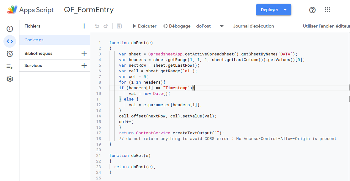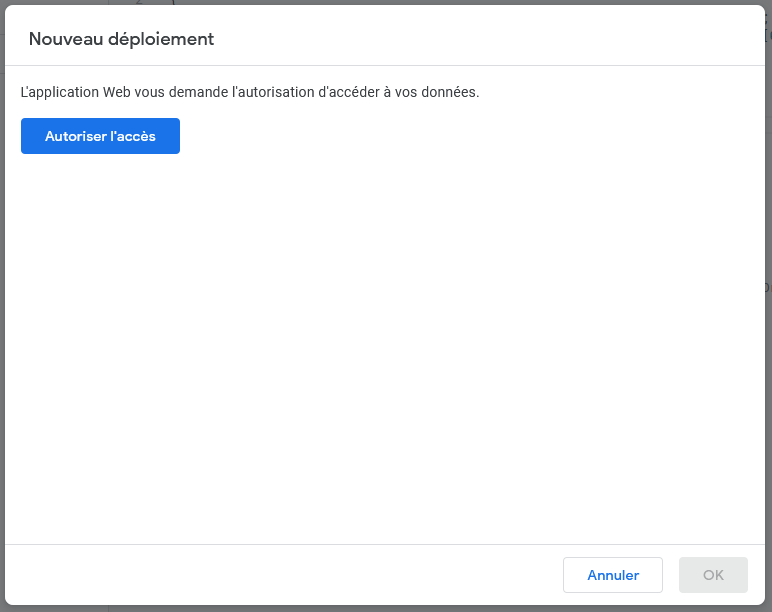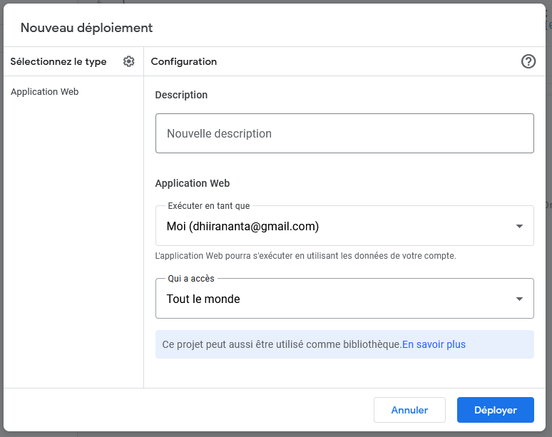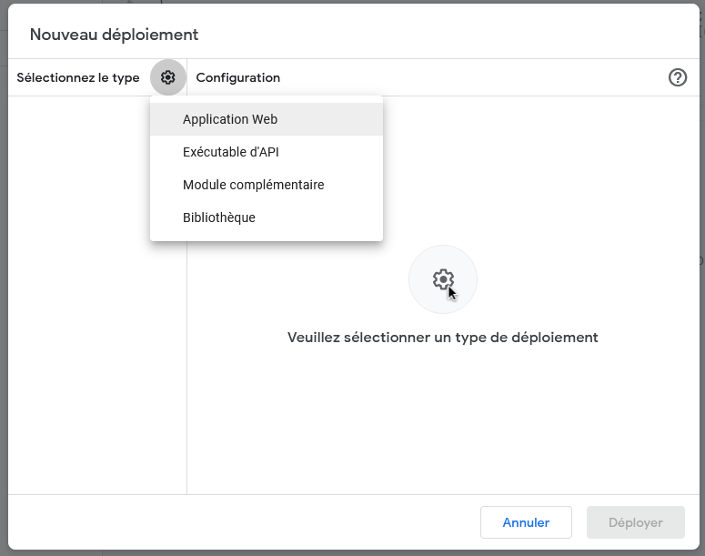 Le code qui représente le web Il est donc nécessaire de le publier dans votre Gdrive, via le bouton Déployer > Nouvelle déploiement :