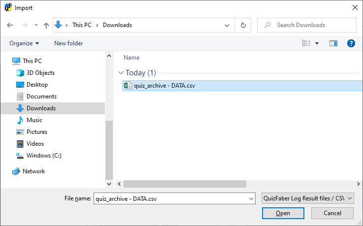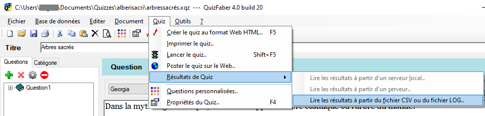 Ouvert QuizFaber, sélectionnez l’élément de menu Quiz, puis "Résultats de Quiz" et enfin "Lire les résultats à partir du fichier CSV ou du fichier log":