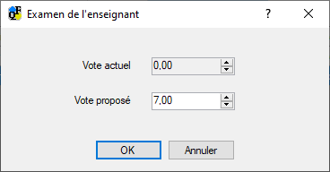 Cette fenêtre affichera la note du quiz en cours, celle qui ne prend pas en compte l'évaluation des réponses avec texte uniquement, et une proposition de vote au quiz global, après que l'enseignant a évalué toutes les questions non évaluées. L'enseignant est libre de confirmer ou de modifier cette note.