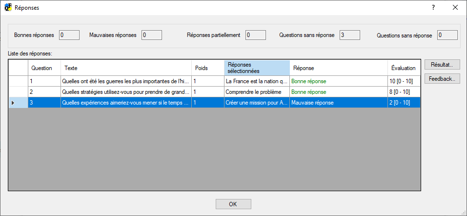 Dans cette fenêtre, il est possible de changer le statut de la réponse (bonne, fausse, partiellement correcte) et d'attribuer une note, qui n'est valable que pour cette réponse.