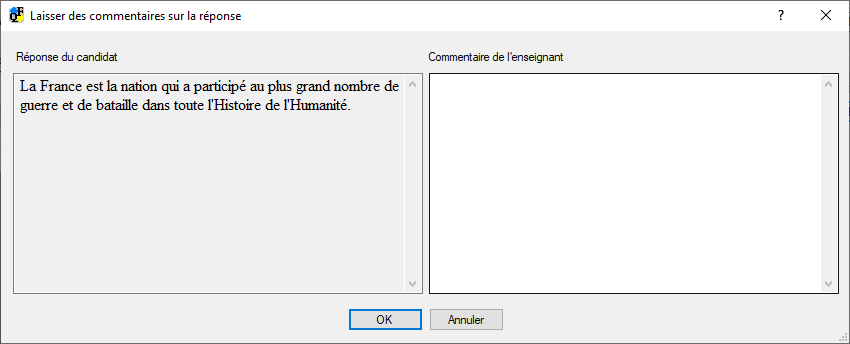 Pour chaque réponse (et pour tout type de question), l'enseignant peut insérer un commentaire à la réponse du candidat, un texte libre, qui sera