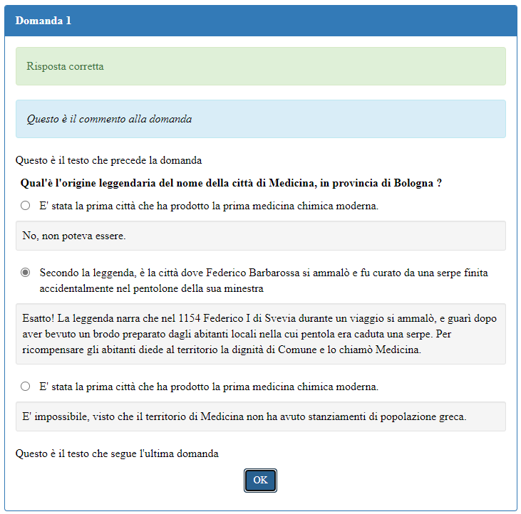 Il commento alla risposta viene visualizzato dopo che l'esaminando ha selezionato la risposta e ha confermato il completamento della domanda (premendo il pulsante OK).