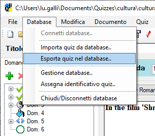 Per esportare le domande del quiz attualmente aperto con QuizFaber, una volta connessi al database, selezionare la voce "Esporta quiz" dal Menu Database, come mostra la seguente figura: