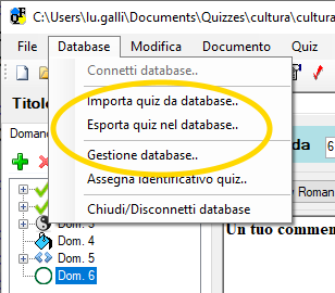 La gestione dei quiz esportati viene effettuata selezionando la voce "Gestione database" dal Menu Database.
