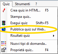 Per pubblicare il quiz sul Web, via protocollo FTP, si selezioni la voce "Pubblica quiz sul Web" dal menu Quiz, oppure dalla barra degli strumenti, penultima icona a destra (icona con il mondo), come mostrato nelle seguenti figure: