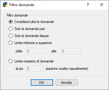 - Un numero prestabilito di domande (inferiore al numero complessivo di domande) scelte a caso tra le domande del quiz.