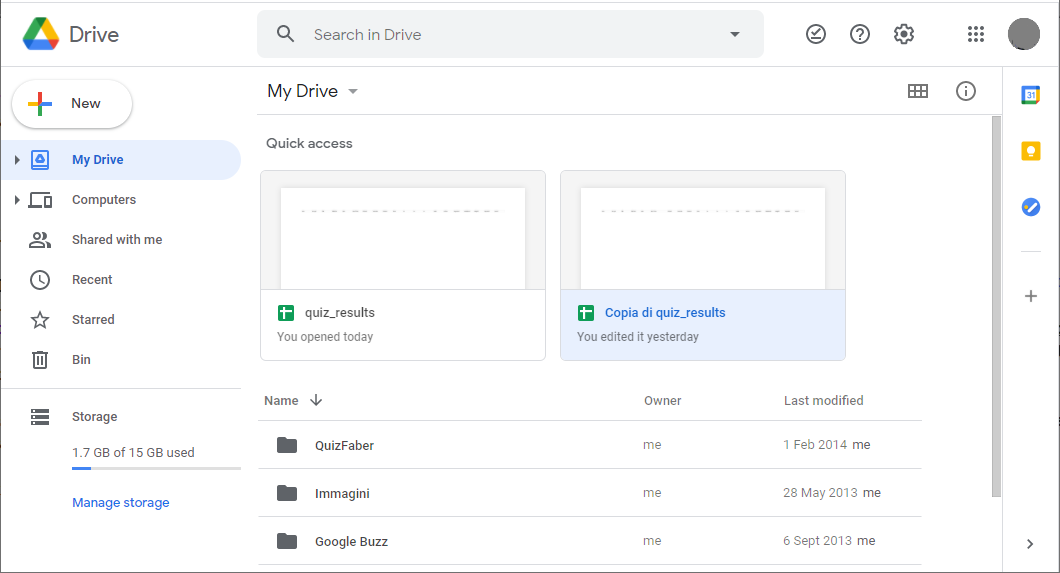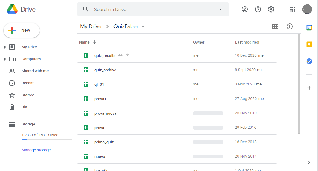 Nella prossima pagina vediamo già il risultato finale, come appare nel mio spazio personale di Google Drive, dove ho creato una cartella di nome "QuizFaber" e ho già creato alcuni fogli di calcolo (Google Sheet).