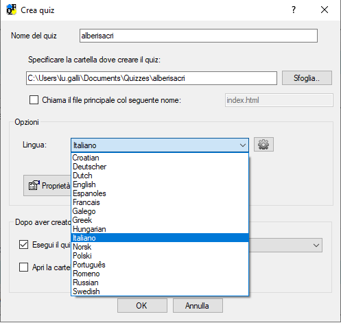 La scelta avviene nella finestra di dialogo "Crea quiz", scegliendo la lingua dalla lista, come mostrato nella seguente figura:
