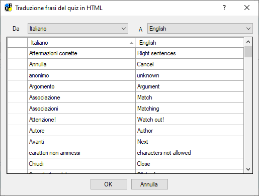 E' possibile scegliere la lingua che il quiz utilizzerà per visualizzare i messaggi, l'intestazione delle domande e i risultati. Ovviamente il testo delle domande e delle risposte, inserite dall'utente, non verranno tradotte.