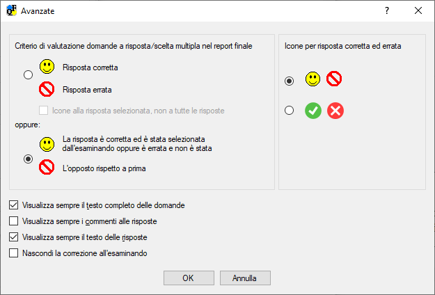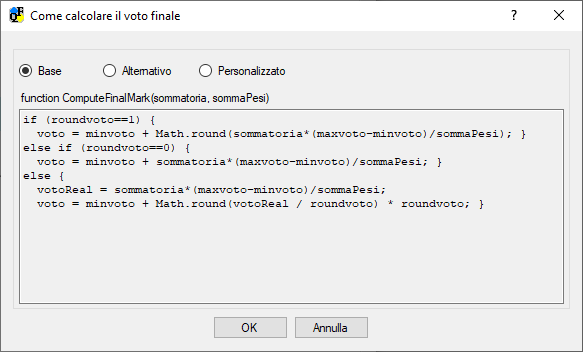 E' anche possibile scegliere la formula di calcolo del voto finale che più si adatta al metro di giudizio del docente. Vengono proposte due formule prestabilite (la prima, "base", è quella standard usata da QuizFaber) e la terza in realtà può essere scritta dal docente, in linguaggio Javascript.