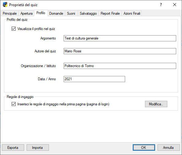 Il profilo del quiz è visualizzabile selezionando la voce "Proprietà" dalla voce di menu Quiz, e quindi cliccando sull'etichetta "Profilo".