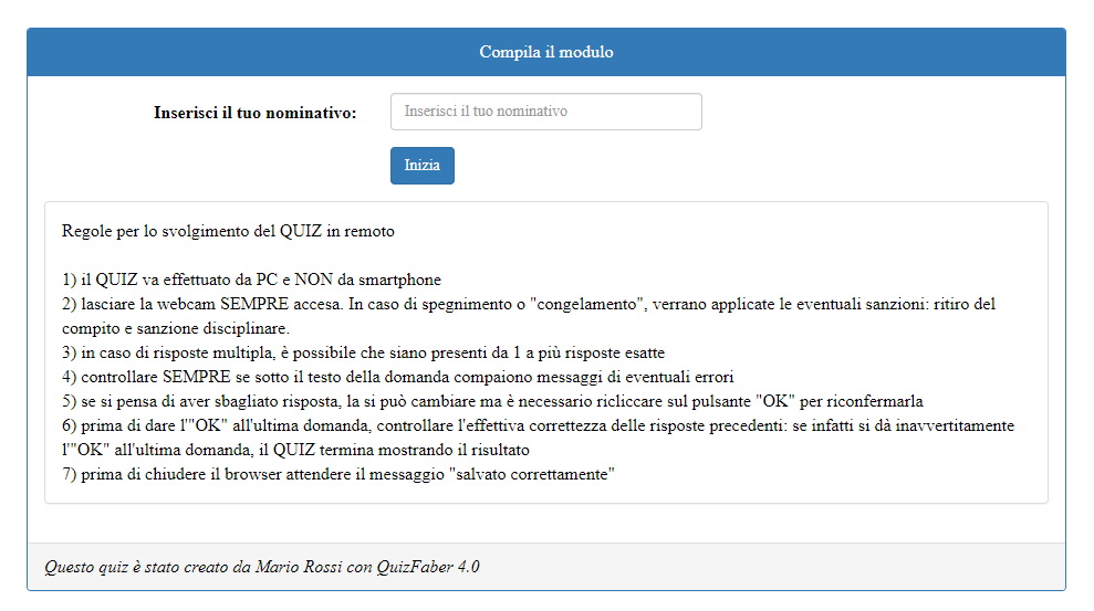 Se necessario, nella prima pagina del quiz (pagina di login) è possibile inserire del testo libero per istruire l'esaminando sulle "regole di ingaggio" ovvero eventuali
